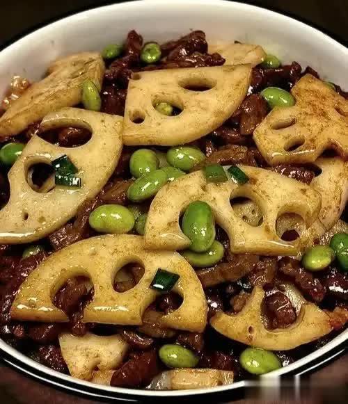 3.热锅炒牛肉至变色盛出,留底油炒毛豆和莲藕至断生