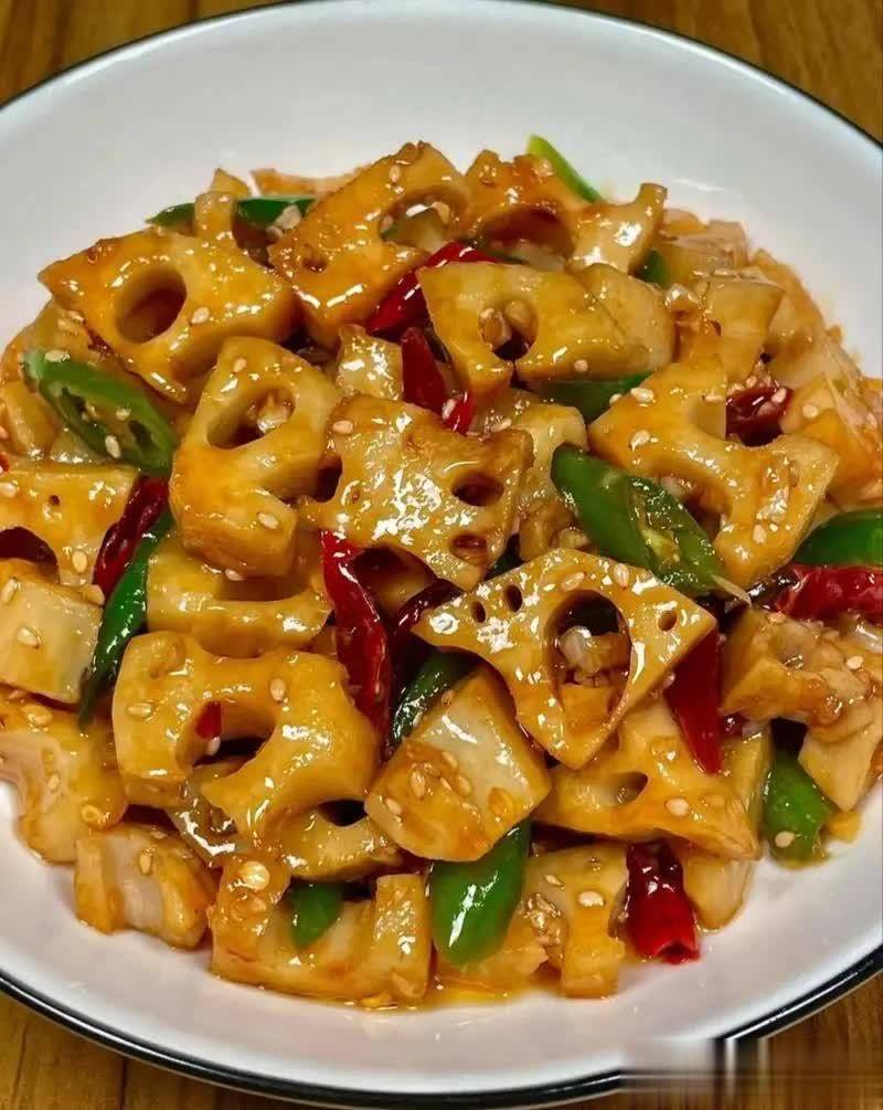 2、倒入焯水的莲藕丁翻炒,加两勺生抽、一勺蚝油、一勺陈醋、少许盐和白糖。